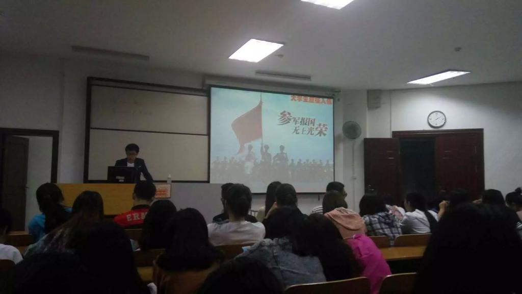 为响应国家征兵政策,鼓励在校大学生踊跃参军,4月24日晚8点,健康科学学院2015级全体同学在东教学楼K105参加了“2016年大学生应征入伍”主题班会。2015级辅导员樊晓明主持召开本次班会。