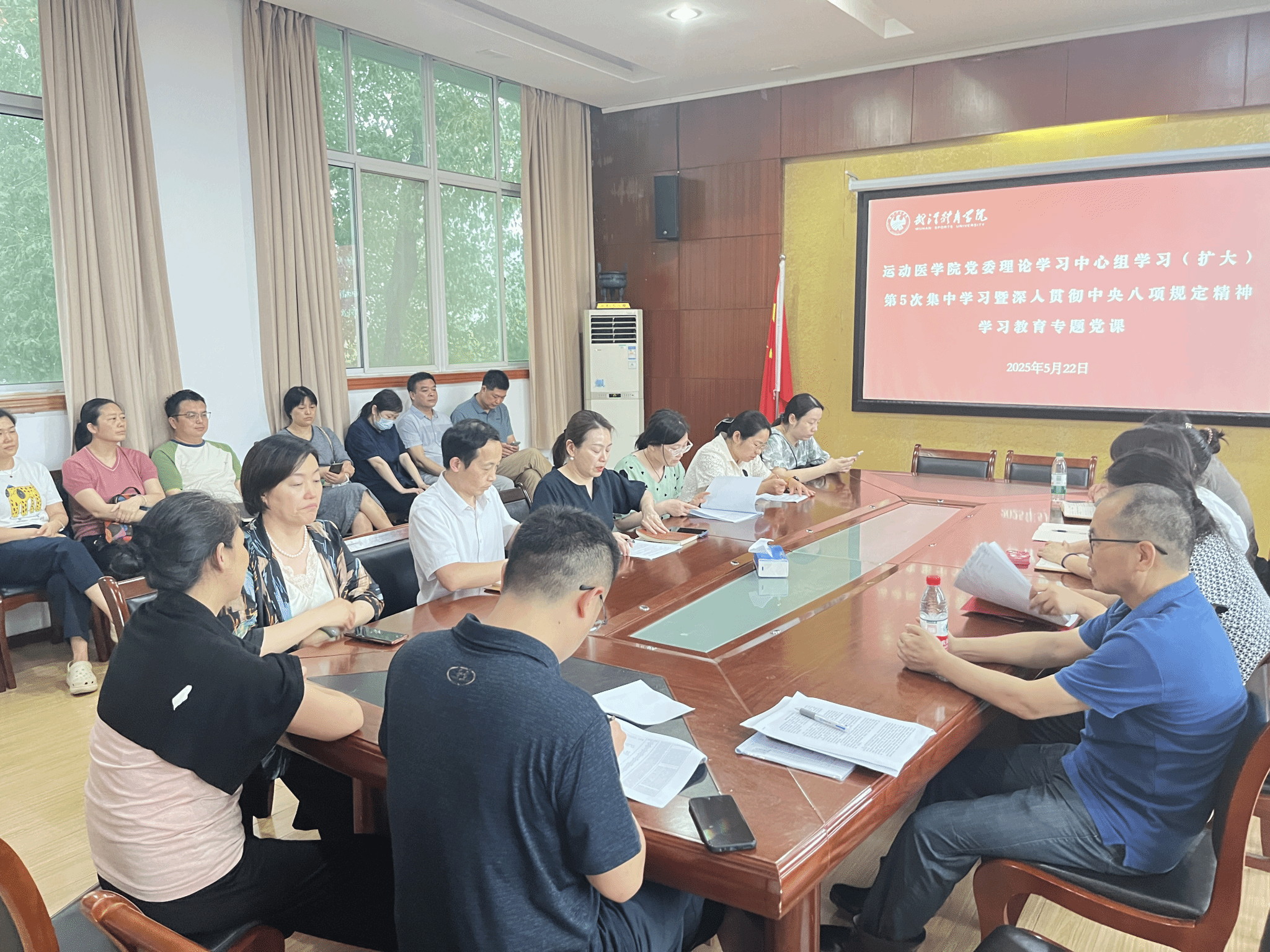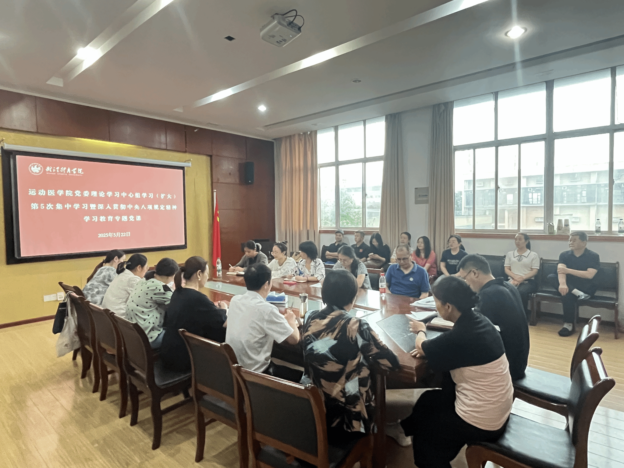 新闻网讯(通讯员雷林林)5月22日下午,运动医学院党委理论学习中心组(扩大)2025年第5次集中学习暨深入贯彻中央八项规定精神学习教育专题党课在学院会议室举行。党委书记李沙丽主持会议,学院全体教师参加本次学习。