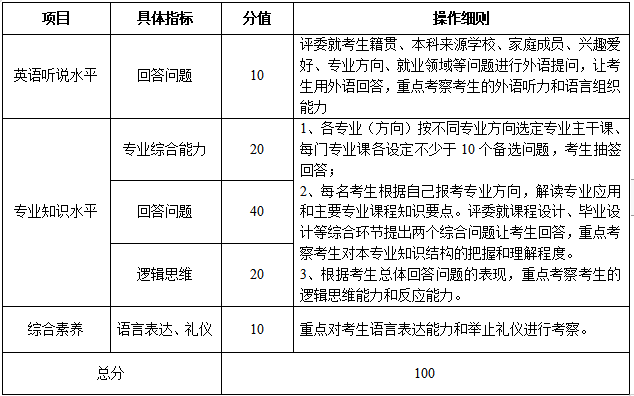 1.综合面试成绩实行百分制,满分100分(其中,英语听说水平10分,专业综合能力20分,专业相关问题回答40分,逻辑思维20分,语言表达10分)。在所有评委的打分中去掉一个最高分、去掉一个最低分,然后取平均分即考生的综合面试成绩。