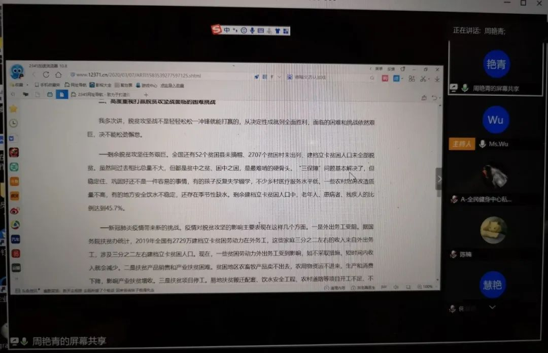 周艳青同学说,今年是全面建成小康社会的关键之年决胜之年,受疫情影响,脱贫攻坚战更加艰难。实现全面建成小康社会是全党对人民的承诺,要人民幸福是全党的目标,实现全面建成小康社会的胜利终将也一定会来到!