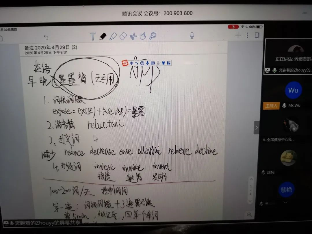 第二环节自由讨论陈楠,陶唯楚同学为武汉大学生出谋划策,分享了自己的看法和建议。陈楠同学推荐了两个公众号(有道生涯、康复医学研究),并建议我们利用剩下的时间考各种物理治疗师证,运动康复治疗师证!还可以从运动康复协会里面发现一些招聘信息,比如学姐学长的推荐。陶唯楚同学认为在“健康中国”大背景下,我们健康院的学生有很多机遇。有百万大学生留汉工程等政策,也可选择考研,出国,抓住各个行业的红利期等众多选择,相信未来学子们将迎来充满机遇与最美好的时代!何慧艳,蔡智毅,陆方媛,王馨瑶,谢放同学为我们讲述了身边的令人感动的抗疫故事。何慧艳同学讲述了甘如怡武汉医生的故事。他骑行四五天奔赴武汉,每天骑行八个多小时,只吃一点干粮喝一点水!向最美逆行者致敬!新时代的大学生党员要学习甘医生的不怕牺牲艰苦奋斗的献身精神!斑竹一枝千滴泪,红霞万朵百重衣!蔡智毅分享了一名安徽援鄂医疗队逆行者的武汉中心医院的一天日记。医生是天使,是国家和民族的英雄!有这些最美逆行者,人民生命安全得到了极大的保障!向最美逆行者学习,学习他们不怕牺牲艰苦奋斗的精神,致敬逆行者!陆方媛讲述了家门口村医的故事。她说由于自己是武汉返乡人员,自己爷爷生病发热,被别人高度怀疑是新冠肺炎,村子里的人都不敢去,只有村医愿意前往,把爷爷送到医院!这名村医冒着被感染的风险,服务民众,做好自己的本职工作,是我们每一个党员应该学习的榜样!王馨瑶讲的是武汉的接车司机的故事。他在疫情期间坚持接医护人员,接志愿者留学生!最美司机这种舍小我为大我的精神值得我们学习,这些逆行者特别伟大,希望这些志愿者司机都能一生平安!谢放讲的是某社区民众为邻居免费发放自己的蔬菜,特殊时期为大家服务的故事。他说这种我为人人的精神,是我们每一个党员应该学习的,我们不能忘记入党誓词,始终以人民为中心!周华轶,张潘冰,蔡晓婉,沈苏萌,张丹,蒋莉,黄诗洁同学分享了一些可以提高学习积极性的APP和方法,希望每个同学都找到属于自己的学习方法,在家也能自主学习,慢慢进步!周华轶同学推荐了APP“墨墨背单词”,他认为首先应该设定目标直到完成,第二是找到正确的方法,比如联想法反义词,形近词,这样更容易掌握单词。